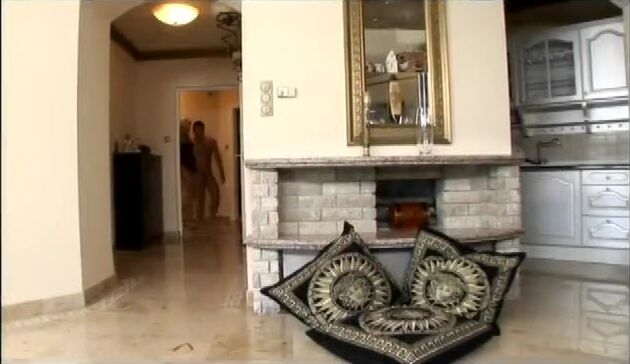 Nasty blonde with fake tits fucked on the floor in front of a fireplace