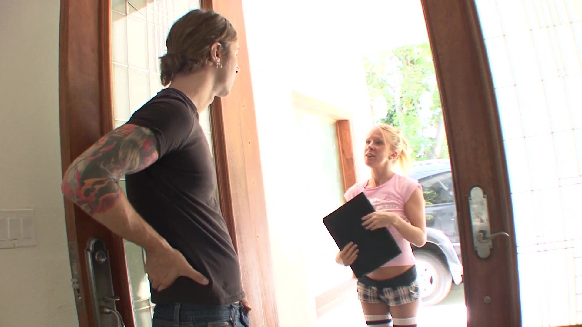 A really naughty blonde neighbor visits the guy next door with some bad horny intentions. She explains how much she loves porn movies and gets him to make his first move of putting those small nipples in his mouth