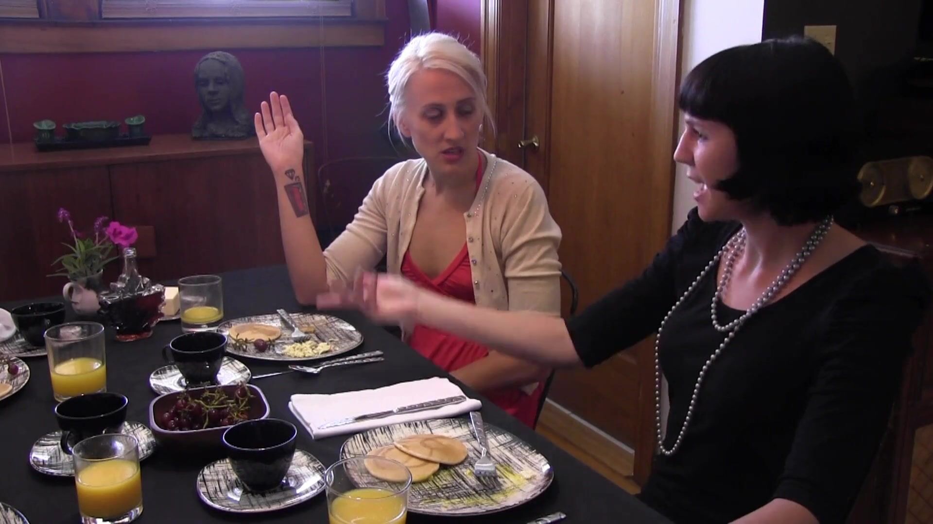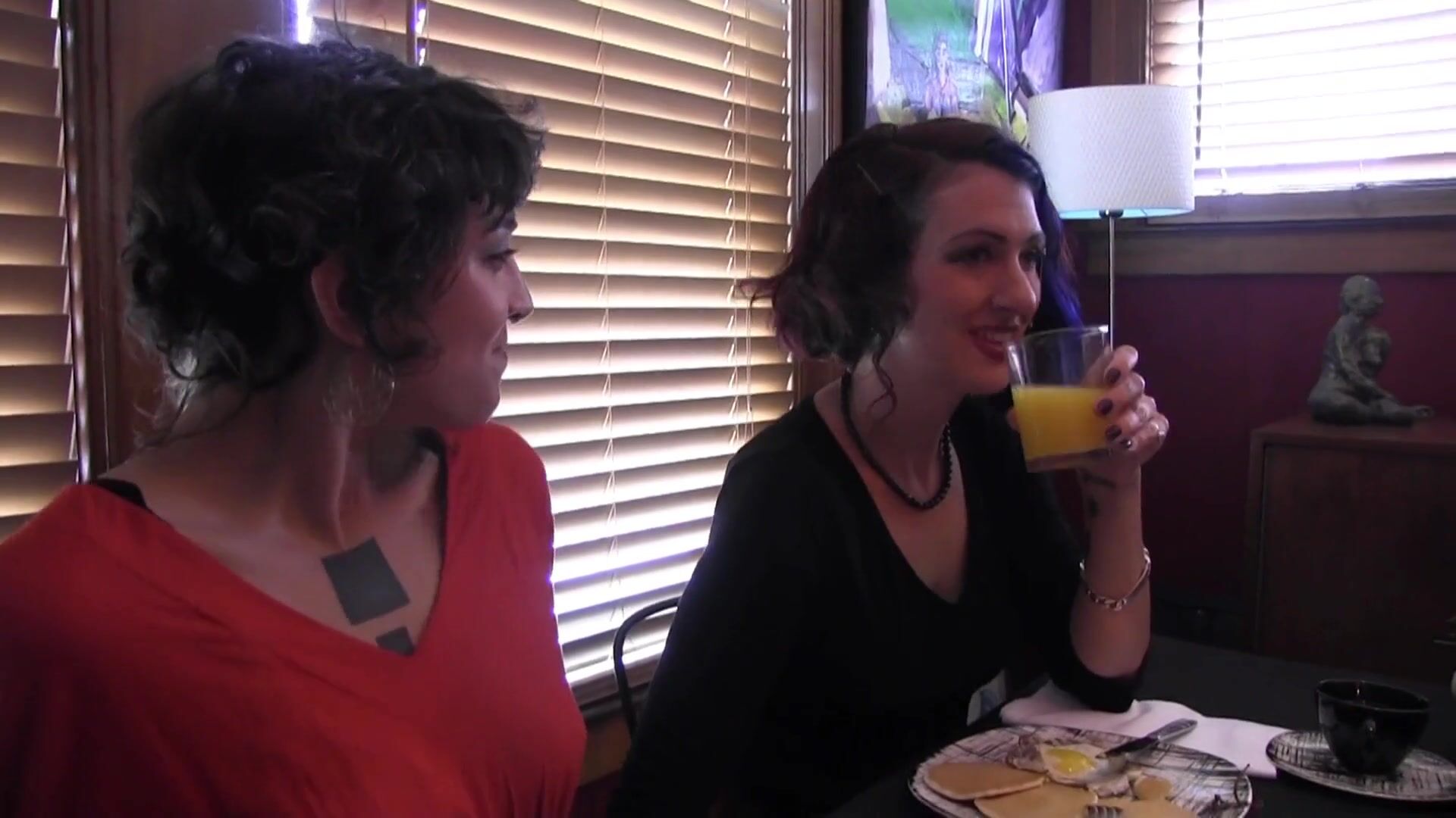Horny blonde watches by the door as the Mistress ties up the hairy armpit goth girl and submits to her will.