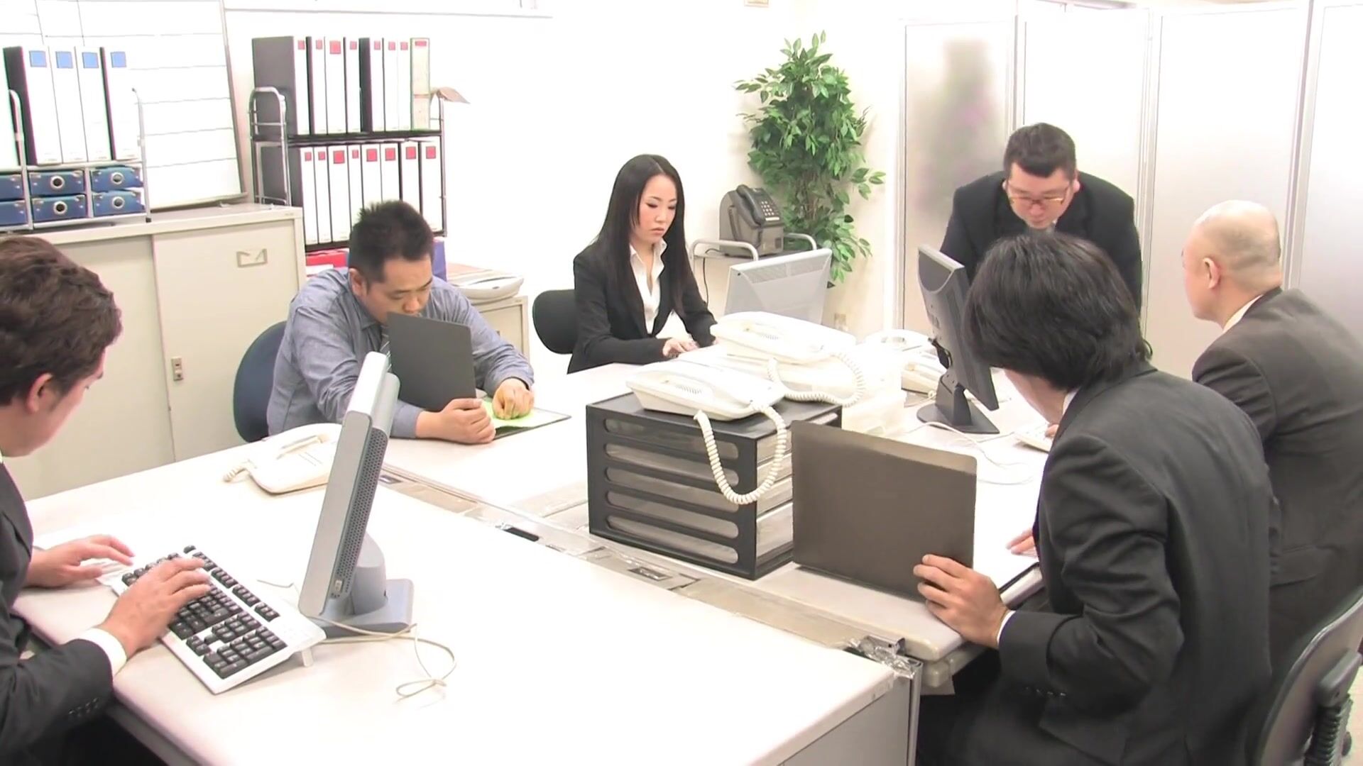 Smoking hot Japanese business woman is in a meeting with a bunch of raunchy dudes. They don't waste any time and pounce on the hot girl. They lift her skirt up and play with her panties while teasing her tender tits. Horny blokes lick her sweet hairy pussy making her moan loud. They finger fuck her until she orgasms, and then she has to satisfy their urges. She gets down on her knees and her face is immediately slapped with many cocks. She tries to gobble them up all, and in the end she receives her reward - hot jizz in her mouth.