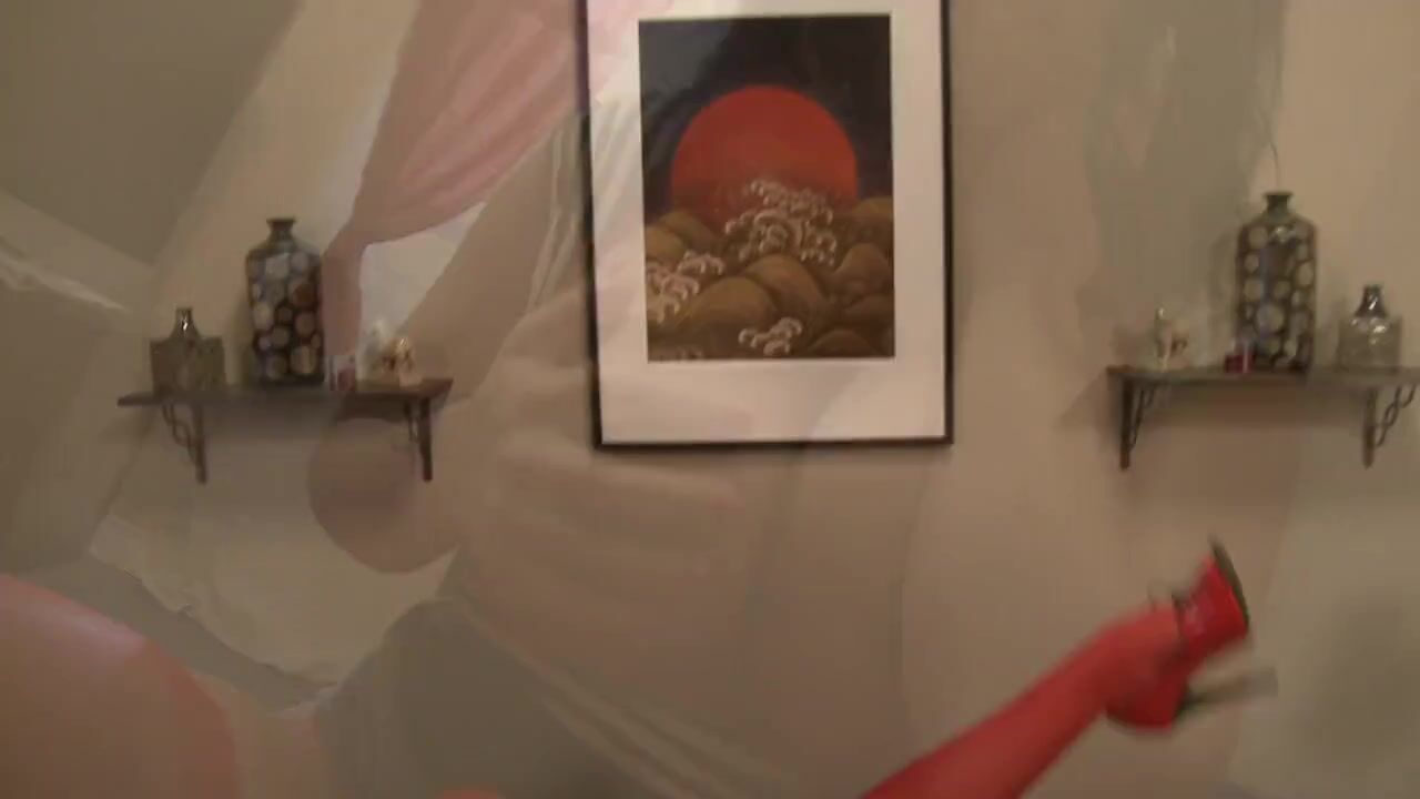 Stunning brunette with a pair of tits is lying on a bed with her lover. He kisses her tender lips and undresses her, leaving her in erotic red lingerie and red thigh-high stockings. He dives between her legs and feasts on her shaved pussy before giving her the chance to suck on his member. She slurps his erect cock and then plants her bald twat on his stiff dong. She rides his hard boner while he gropes her big soft ass. Her lover drills her delicious pussy hard, and splashes her huge boobs with a big load of hot jizz.
