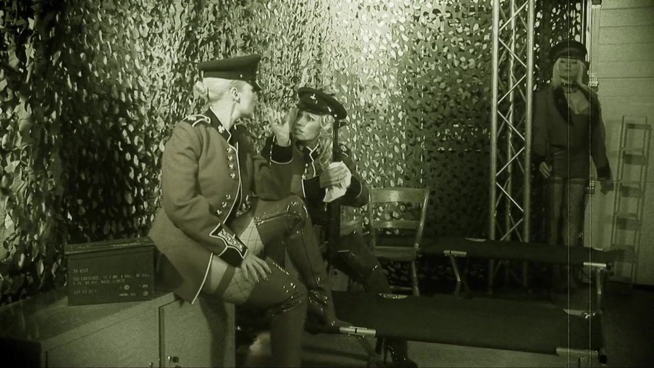Lovely soldier girls are having naughty fun in a bunker. The girls lick and kiss each other's pussy until a big dildo is introduced into the mix. The girls suck on the dildo and use it to penetrate one another. A horny dude interrupts the naughty girls and offers to provide them with a real dick, which the girls graciously accept. He satisfies the girls by licking their delicious wet twats, making them hornier by the second. Girls slurp his throbbing member and take it in their moist cunts until all of them are satisfied with their kinky romp.