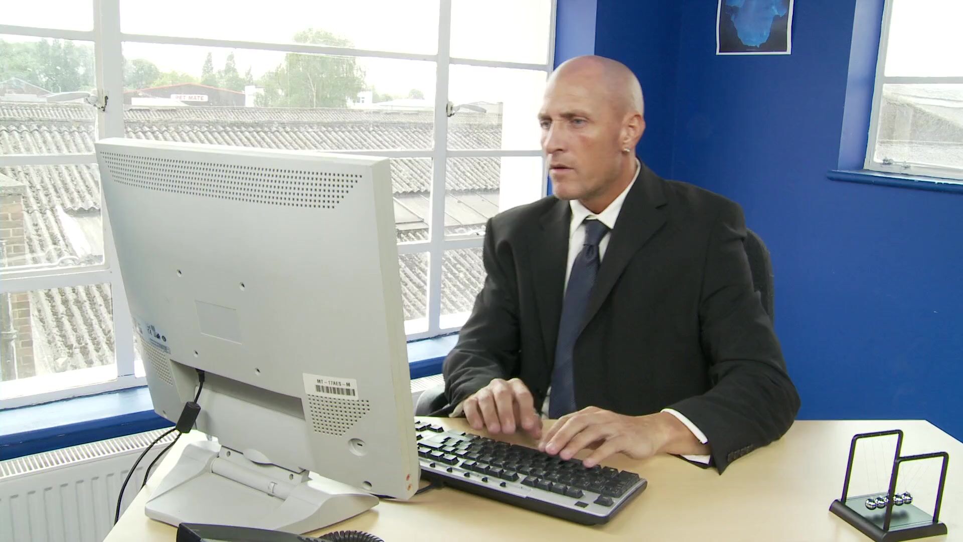 Big boobed babe fucks a bald bloke in his office
