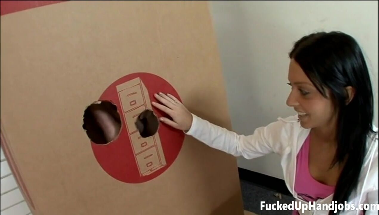 Stephanie Kane show a dick in a box and gets horny. She handjob a dick and strip off her clothes showing her natural tits and sexy body and the guy love it until cumming