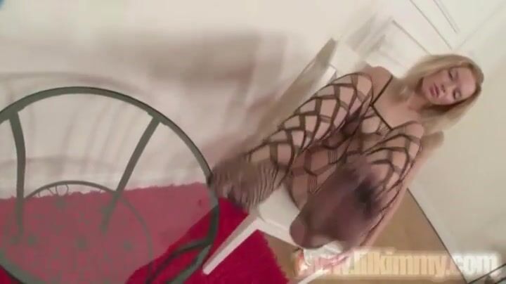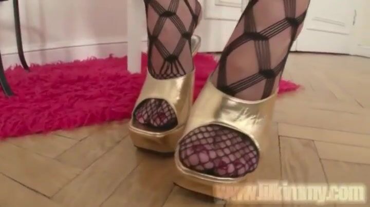 Lil Kimmy gets all dressed up for her evening sex. Fishnet stockings and high heels with her pussy.