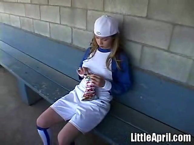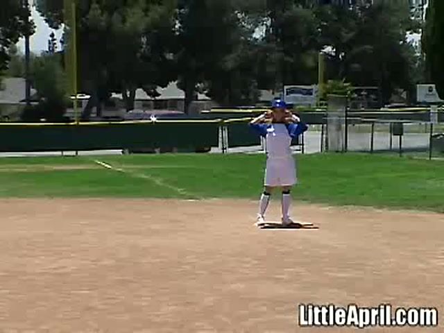 Sweet teen Little April likes to play with her petite body after she sheds off some heat with a game of baseball.