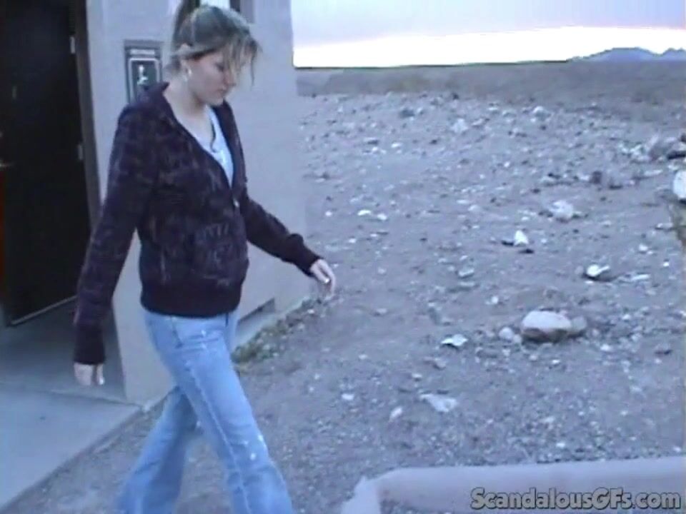Hot Blonde invite her boyfriend in public CR and blowjob a dick while she showing her breat. She continue blowjob on car