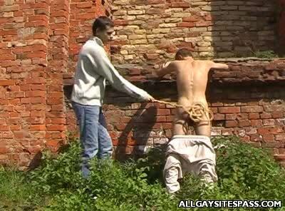Check out gay dominatrix Leo and his slave as they go for an outdoor BDSM in this scene. Watch Leo as he humiliates his slave and asks him to pull down his pants and lean against the wall, so that he could start slapping his ass till it's red and bruised.