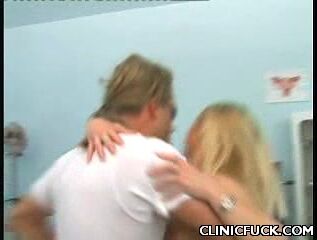 This sexy blonde wearing a very short skirt is in to have her pussy checked and soon this male nurse assisted her, starting off by making her take off her panties and gave her pussy a good dose of licking and probed it deep and hard with his big stiff shaft.