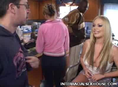 Alicia Rhodes came early for her shoot, she's eager to get fucked by a group of horny black guys and here she began by doing a little show in front of the camera. Soon these guys stepped in and began cramming her pretty white face with enormous black dicks.