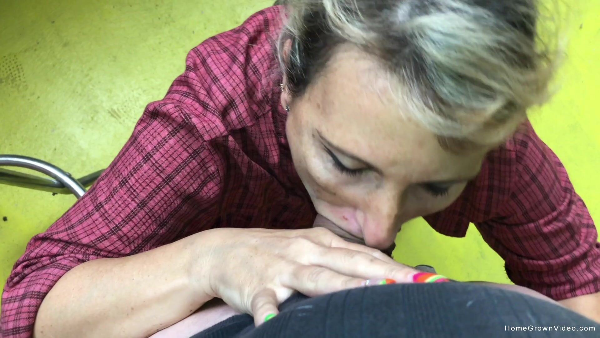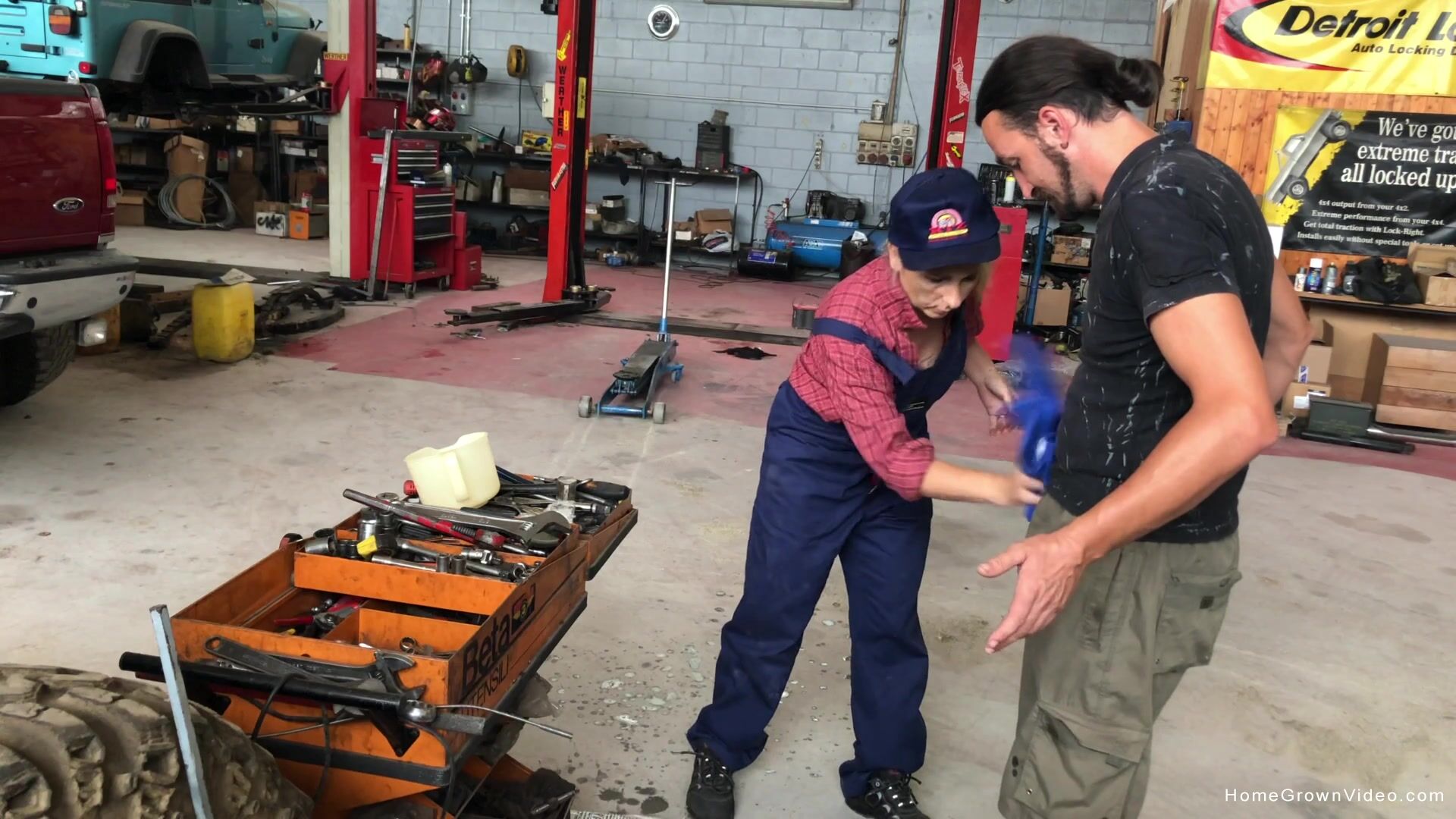 A guy stopped at a car repair shop to get his car repaired, but ended up getting hot fucked by a mature bitch.