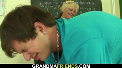 Very old granny blonde teacher swallows two cocks