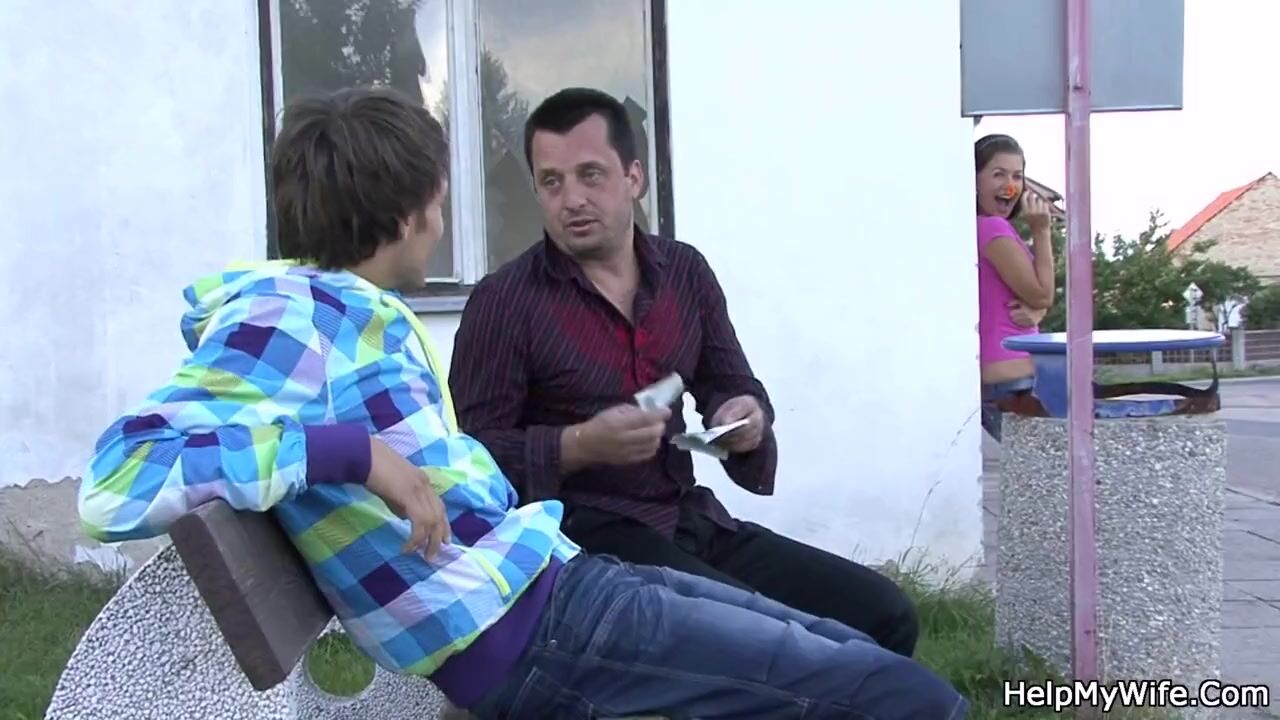 Old man shares his brunette wife with a stranger